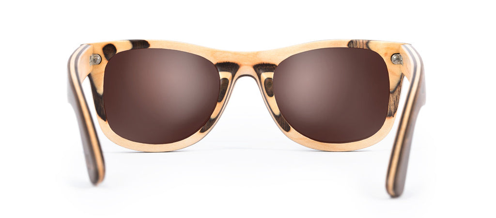 Our Skateboard sunglasses edition is here! Each pair is handcrafted from durable 7 ply Canadian maple skateboard laminate and features polarized lenses. With a classic wayfarer look, the skate maple (small) is designed for those with slender faces. A popular choice for women, the skate maple (small) combines a beautiful lightweight feel with a stylish layering of natural and brown stained maple tones to create a timeless, chic style.